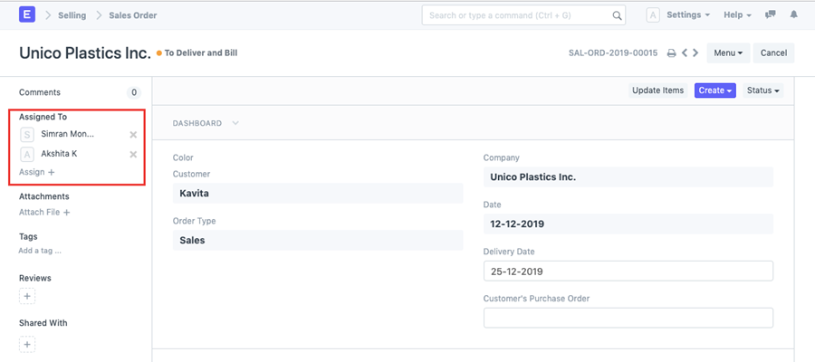بالمثل، يمكن إسناد مذكرة تسليم وفاتورة مبيعات لمستخدم المواد ومستخدم الحساب على التوالي لهذا الطلب (طلب المبيعات).