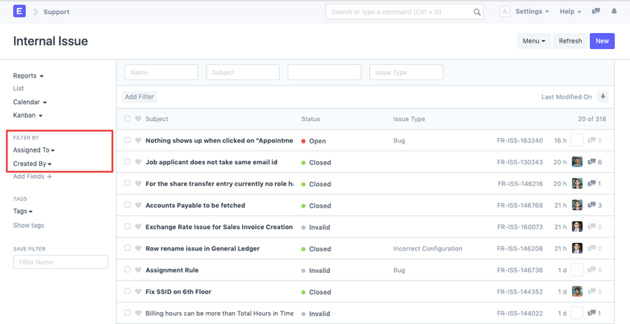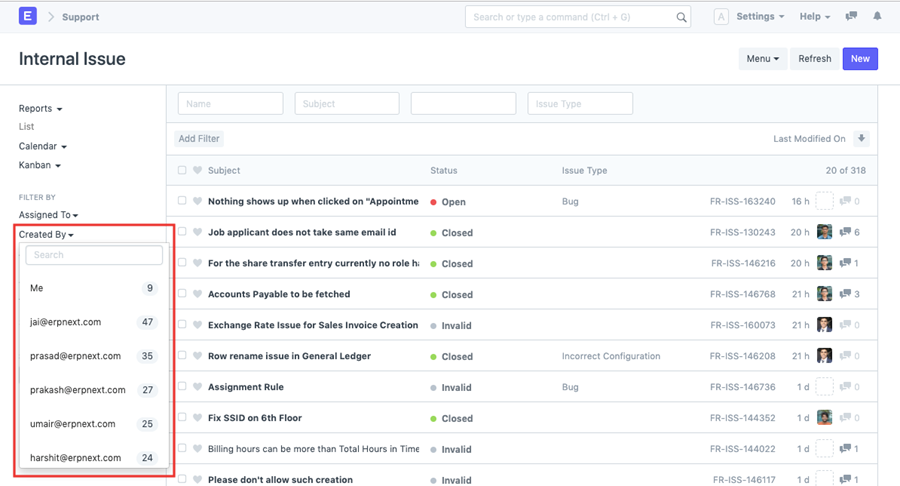 تماماً مثل " مُكلّف إلى"، ستتمكن أيضًا من فلترة المستندات بناءً على المستخدم الذي أنشأها. على سبيل المثال، إذا كنت ترغب في التحقق من جميع المشكلات التي تم رفعها بواسطة مستخدم معين، يمكنك القيام بذلك من هنا.