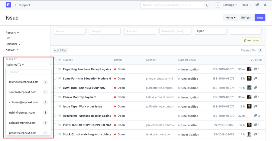 عند عرض قائمة أو تقرير للمستندات مثل الفواتير، والعملاء المحتملين يمكنك فلترة نتائج البحث لعرض المستندات المكلفة الى شخص معين فقط. قائمة مُكلّف إلىستعرض أيضًا عدد المستندات المكلفة لكل فرد.